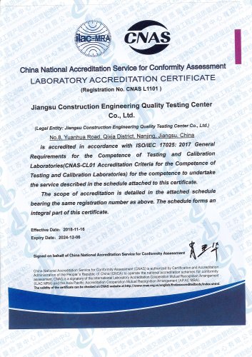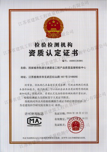 國(guó)家城市軌道交通建設(shè)工程產(chǎn)品質(zhì)量監(jiān)督檢驗(yàn)中心, 依托江蘇省建筑科學(xué)研究院和江蘇省建筑工程質(zhì)量檢測(cè)中心在城市軌道交通建設(shè)工程領(lǐng)域的綜合技術(shù)優(yōu)勢(shì),于2016年10月獲得國(guó)家認(rèn)證認(rèn)可監(jiān)督委員會(huì)批準(zhǔn)授權(quán)..